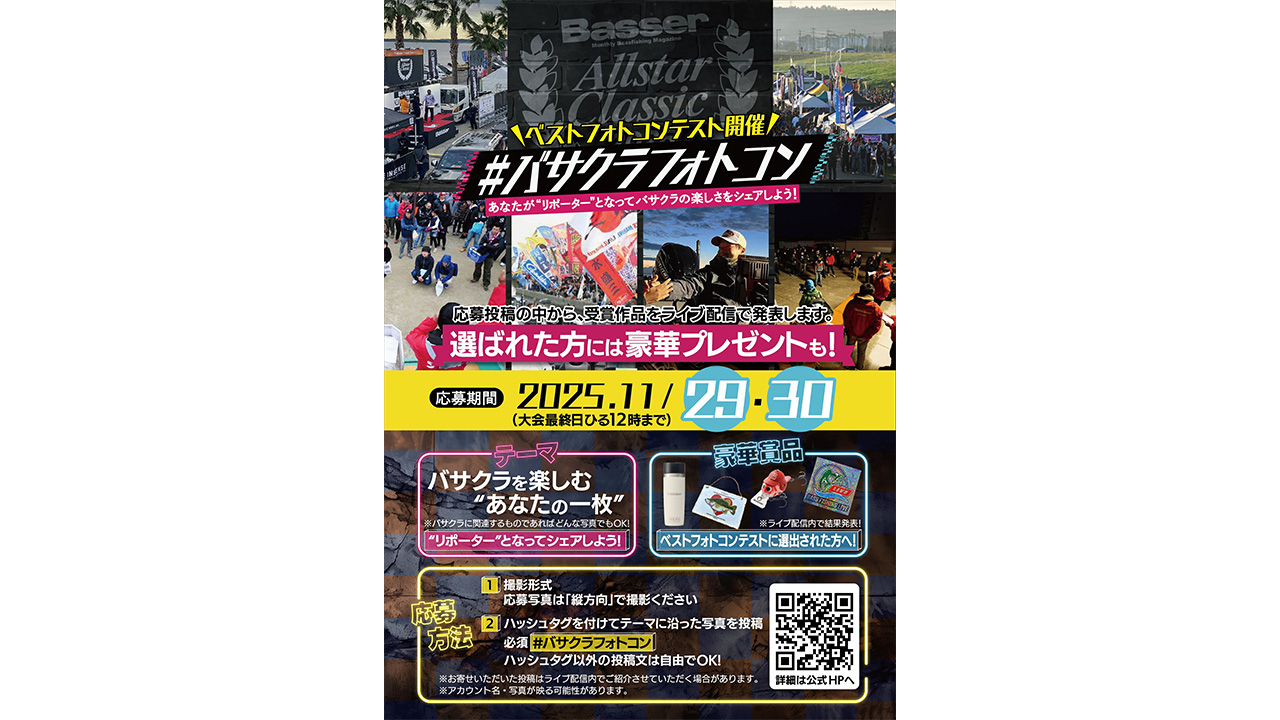 2025年11月29日(土)、30日(日)の2日間、千葉県香取市「水の郷さわら」にて行われる「Basser Allstar Classic 2025」会場にて、あなたの記憶に残るBasser Allstar Classicの1シーンをXにて「#バサクラフォトコン」で投稿していただく【Basser Allstar Classic 2025 LIVEフォトコン #ハッシュタグキャンペーン】を開催。